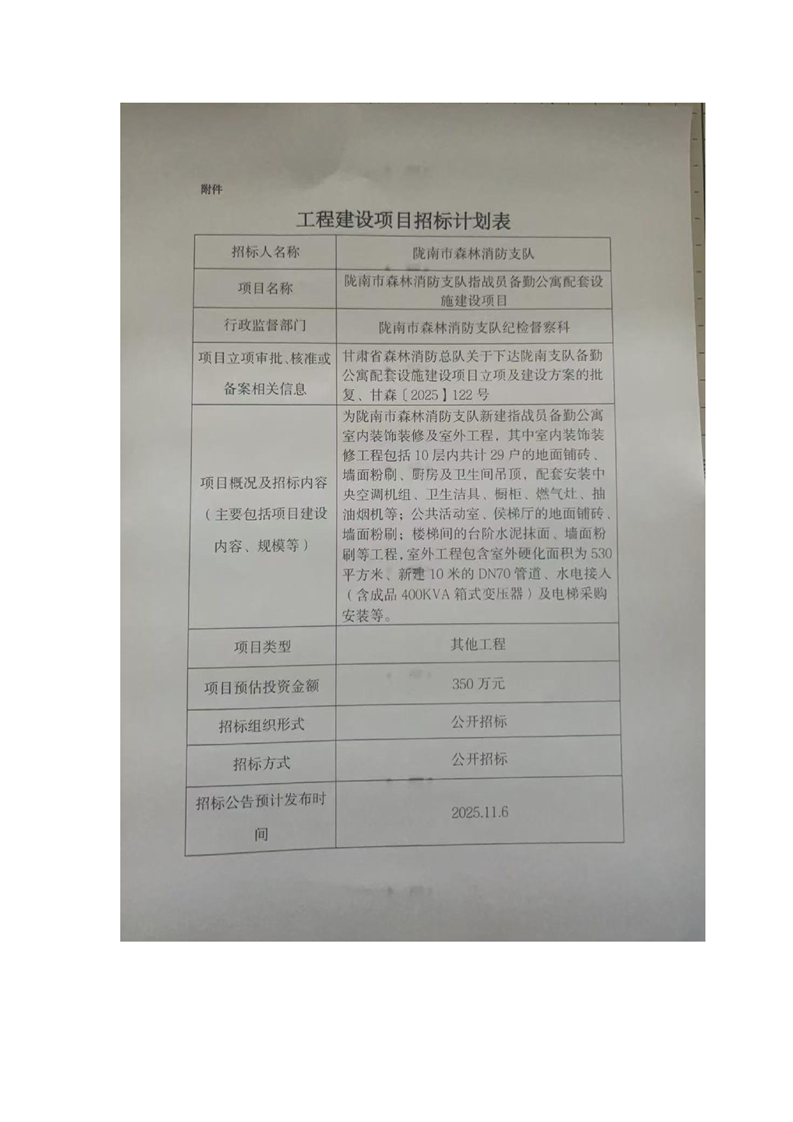 隴南市森林消防支隊指戰(zhàn)員備勤公寓配套設施建設項目